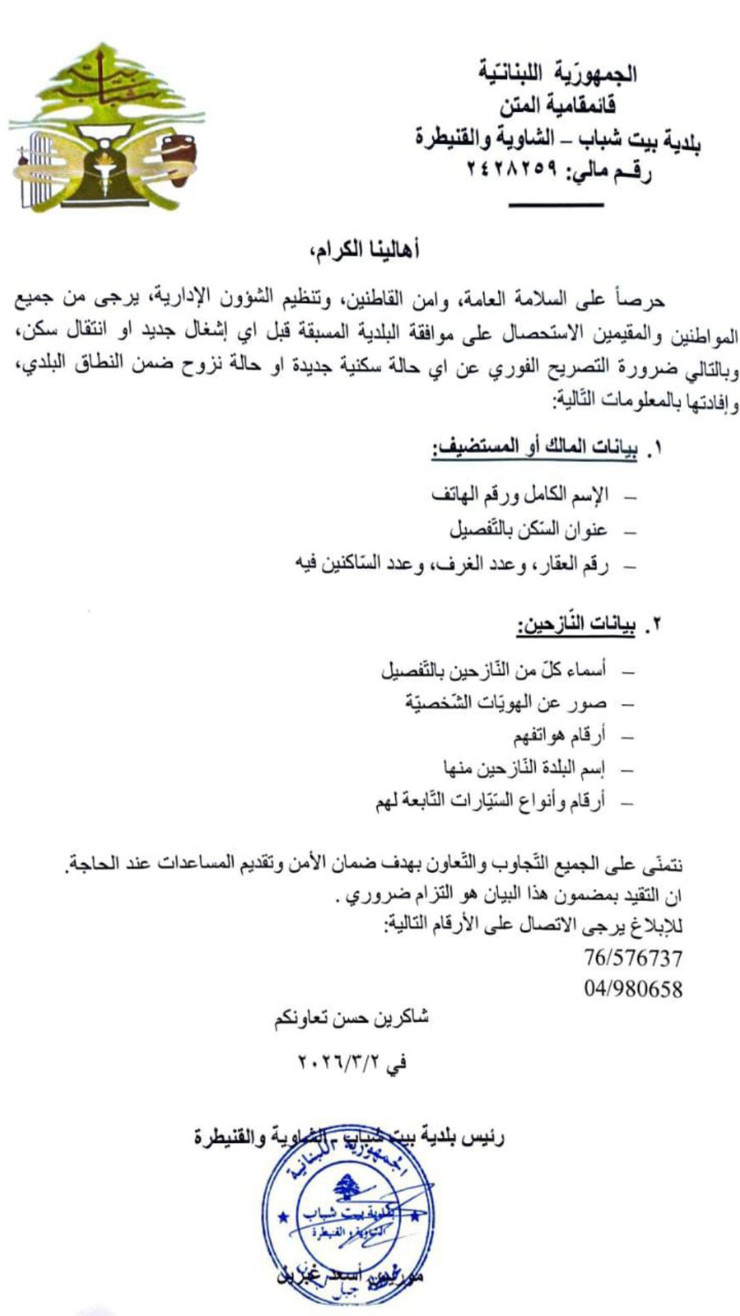 تعميم بوجوب التصريح عن إشغال جديد أو انتقال سكن ضمن نطاق بلدية بيت شباب